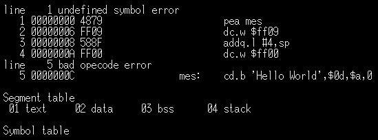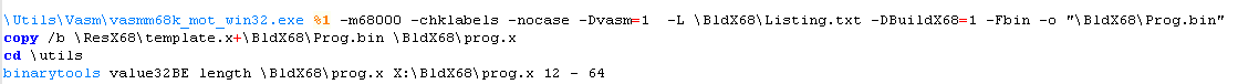 executable files... I use this build command in my batch files.![]() We need to specify the source asm file to compile we're specifying the processor type as 68000 We're specifying that VASM should ignore case, and check if labels look like commands (in case we forgot our tab on a command) I define a couple of symbols, but you won't need them for the simple example... We're telling VASM to output a listing. This is a text file which shows how the asm commands convert to bytecode... We don't need it - but it may help us if we have problems! We need to tell vasm to build an Xfile - this is the executable file type of the x68k Finally, we specify a filename for the output file |