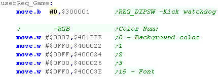 the background color 0... and the font color (15)... We do this by writing an 'address' to the VDP control port, then a pair of bytes for the color to the data port. The address format for the palette is $C0nn0000 - where nn is the color address (Color *2 as we have 2 bytes per color) |