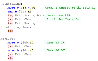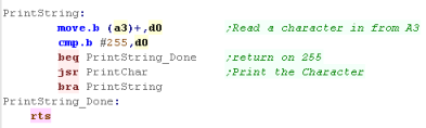 PrintString Routine - it'll use Char 255 terminated strings. We just send each character to PrintChar until we get to the 255 |