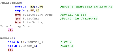 PrintString Routine - it'll use Char 255 terminated strings. We just send each character to PrintChar until we get to the 255 We also need a newline function to zero the Xpos, and INC the Ypos |
