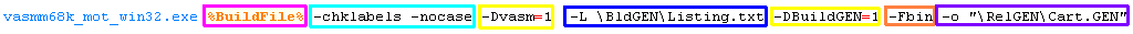 files.![]() We need to specify the source asm file to compile We're specifying that VASM should ignore case, and check if labels look like commands (in case we forgot our tab on a command) I'm specifying to output 68000 CPU code I define a couple of symbols, but you won't need them for the simple example... We're telling VASM to output a listing. This is a text file which shows how the asm commands convert to bytecode... We don't need it - but it may help us if we have problems! We need to tell vasm to build an BINary file Our source sample will only compile correctly in DevPac mode Finally, we specify a filename for the output file |