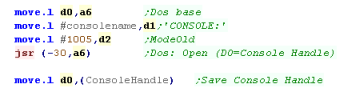 'CONSOLE:' in D1 This function returns a handle for the console in D0... we'll store this for later. |