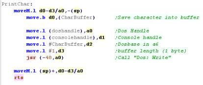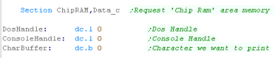 to get access to the console screen... First we need to use the 'Exec' function to gain access to the 'dos.library' Library, we call this with a JSR, and get the dos handle back in D0... which we save for later! When we make the call, we load A1 with a string containing the library name... we'll also define one for the 'Console:' which we'll need in the next stage. We also need to define some ram bytes to store the handles returned by the OS... we also use a single byte as a character buffer - as we need to pass an address to the printing routine to get our characters onscreen. |