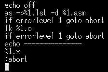 the same syntax. Here's a batch file to assemble, link and run our program - if at any stage an error occurs, the process will jump to the abort label. Create this in ED with the command ED assemble.bat |