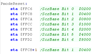 bit. Effectively the address of the screen base is:%DDDDDDD0 00000000.... where D is the bits we can change, and 0 is fixed bit zeros The example code here will reset the screen base to $0400 Writes to $FFC6-D2 set all the bits to 0... Then bit 1 is set with a write to $FFC9. |