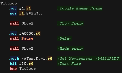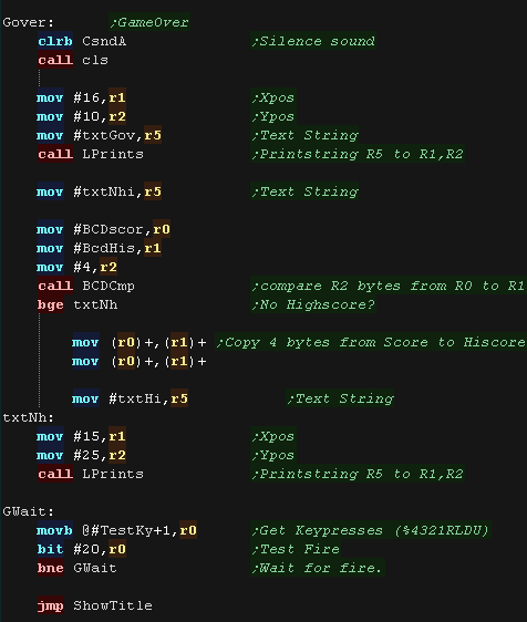 shows the game over message. Next we check if the score is higher than the highscore. if it is we update the highscore and show a different message. We wait for fire before returning to the title screen. |